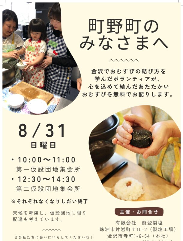 能登製塩さんの塩と地元のお米を使って、仮設住宅に暮らす方々へおむすびをお届けしました。