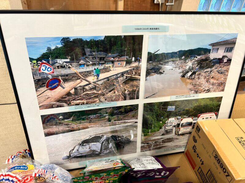 皆さんの投稿などで見聞きしていたけれど、地震のあと豪雨で店内がかちゃかちゃ、店の前が洪水で流れ、大変な思いをされたにも関わらずすぐに動き出し町の生活を守った町野町のもとやスーパーさん。