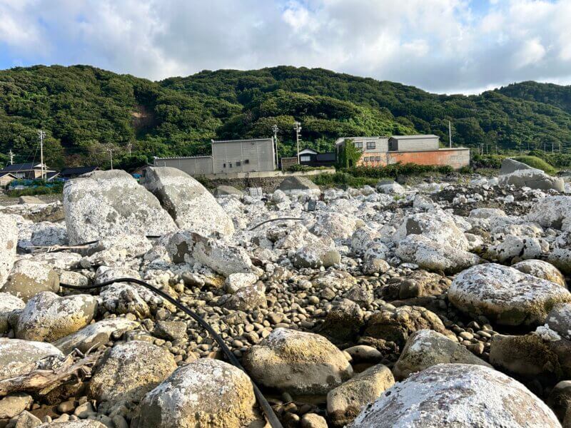↓こちらの写真は10年ほど前の取り扱いを始めたばかりの頃に工場を訪ねた際に私が撮った写真です。撮影場所のすぐ下が海でした。この部分が、地震で盛り上がったのです。