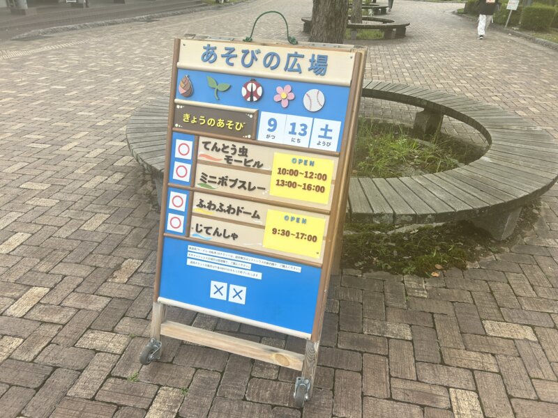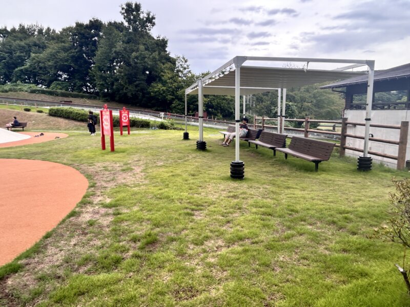 屋根はないですがフワフワドームの横にもベンチがあり、子どもたちが遊んでいるのを見守りながら、座れるのは本当に助かります。