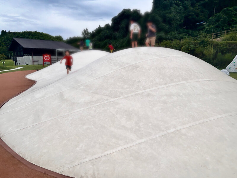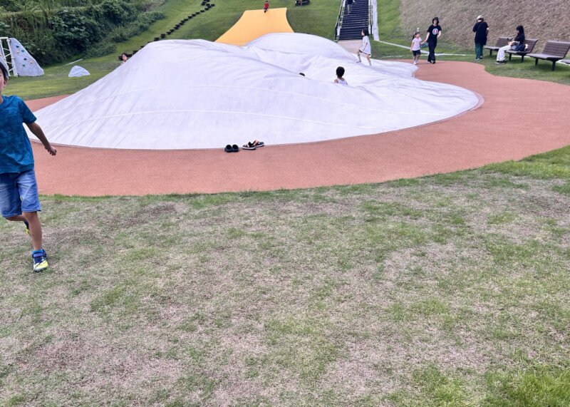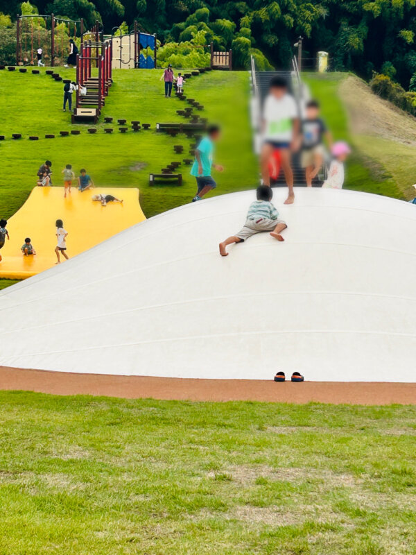 ふわふわドームで飛んだり、黄色い大きな滑り台を滑ったり、坂を駆け下りたりと子どもたちは汗だくになりながら大はしゃぎ。
