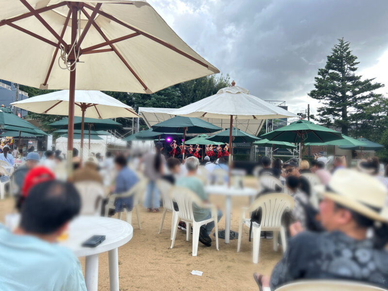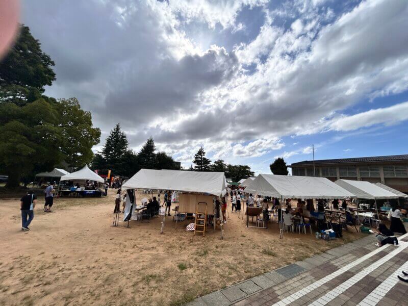 グラウンドには大きなステージとテント、中央には机と椅子が並び、お祭りらしいワクワクした雰囲気!駐車場もありますが、公共交通機関の利用が推奨されています。