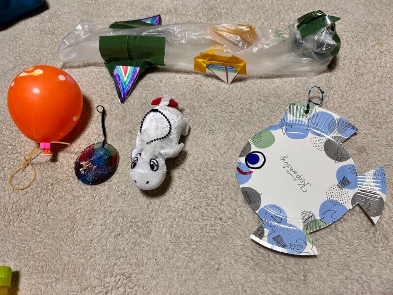 手作りのお魚釣りゲーム(無料)。釣ったものをひとつプレゼントしていただきました。手作りのお魚がいろいろ、独創的で見てて楽しい♪